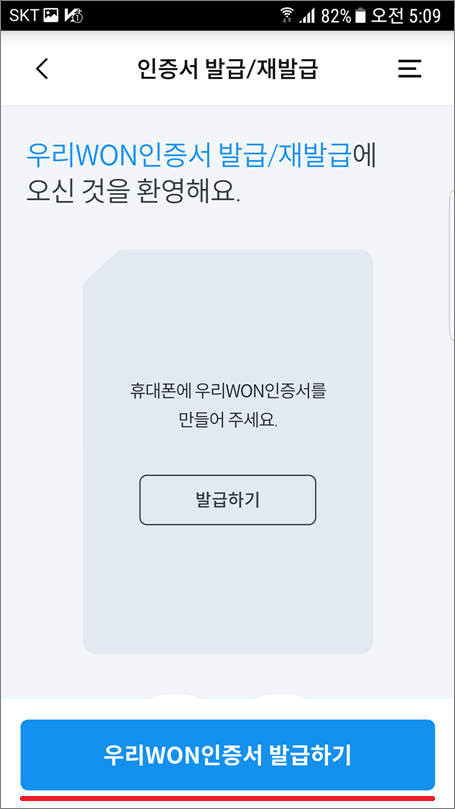 ④. 우리WON인증서 발급하기 선택합니다.