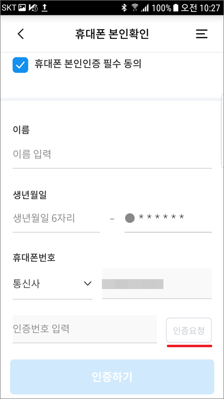 ⑥. 휴대폰 본인인증 필수 동의 체크하고 이름, 생년월일, 통신사 선택하고 인증요청합니다.