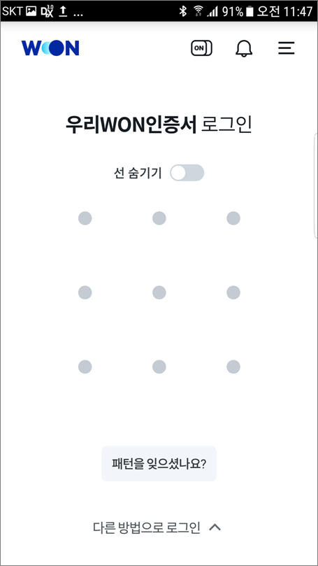 지문 또는 패턴 로그인 방식은 우리WON인증서를 발급받아야 가능합니다.