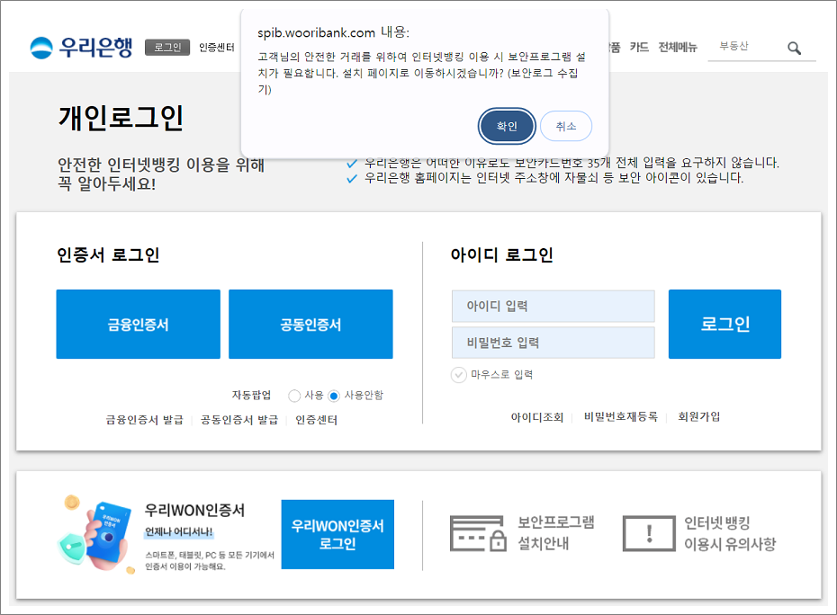 우리은행 보안프로그램을 설치하지 않으면 로그인 화면에서 무한로딩을 하기 때문에 인터넷 뱅킹을 위해서는 보안프로그램을 설치해야 합니다.