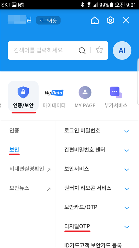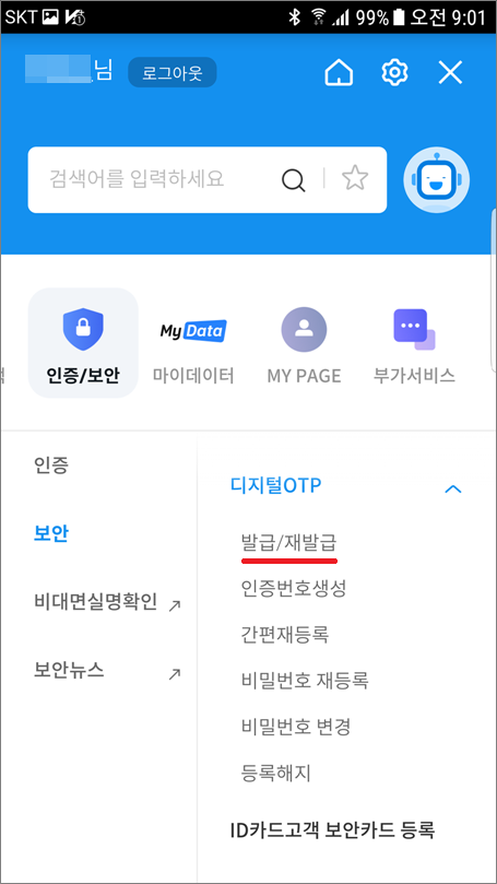 ④. 디지털OTP에서 발급/재발급 선택합니다.