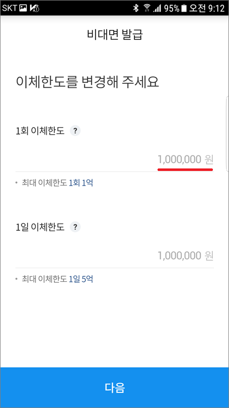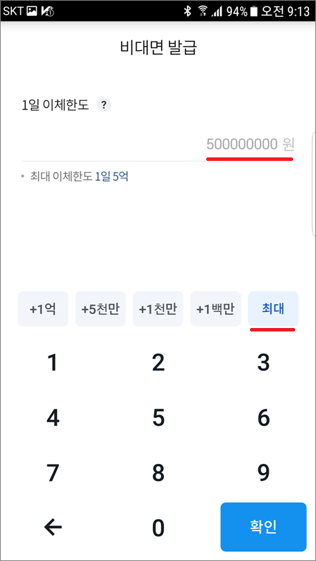 ⑩. 1일 이체한도를 5억으로 설정할 수 있습니다.