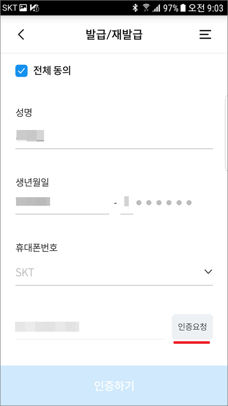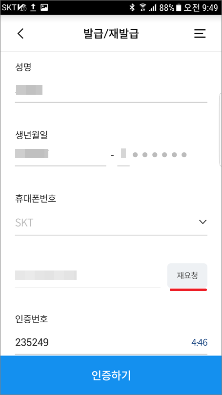 ④. 문자가 오면 인증번호는 자동으로 입력되고 자동으로 입력되지 않으면 재요청 선택하면 다시 문자가 와서 자동으로 입력됩니다.