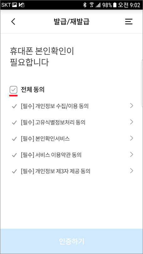 ②. 휴대폰 본인확인이고 전체 동의에 체크합니다.