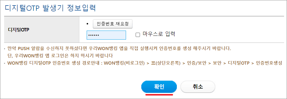3. 디지털 OTP에서 인증번호 6자리를 생성해서 PC의 인증번호 입력칸에 입력하는 방식입니다.