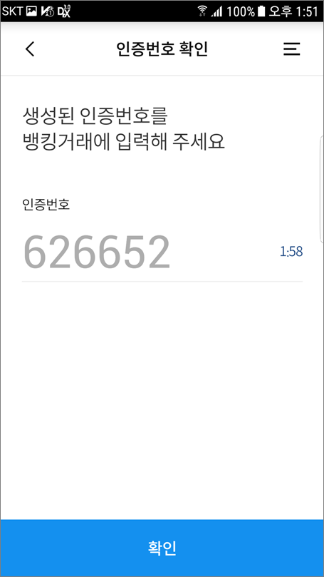 ⑥. 자동으로 6자리 인증번호 생성되고 PC의 인증번호칸에 입력하면 됩니다.