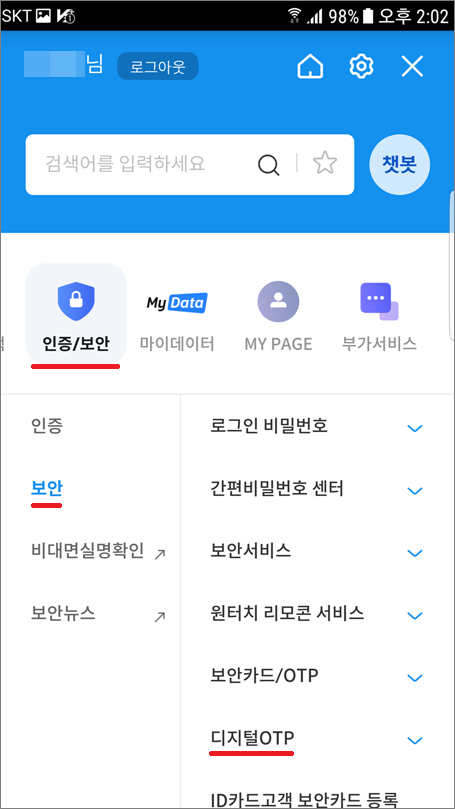 ⑪. 인증/보안에서 보안 > 디지털OTP 선택합니다.