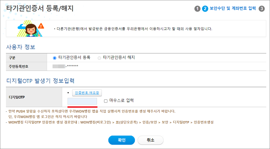 4. 공동인증서 발급/재발급, 금융인증서 발급/재발급, 타기관 인증서 등록/해지, 인증서 폐지 등 인증서 관련해서는 대부분 디지털 OTP에서 인증번호를 생성해서 인증을 받아야 합니다.