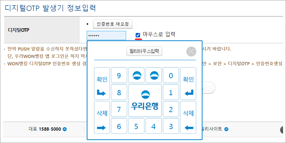 키보드 보안프로그램을 설치하지 않은 경우는 반드시 마우스로 입력에 체크하고 멀티마우스로 입력해야 합니다.