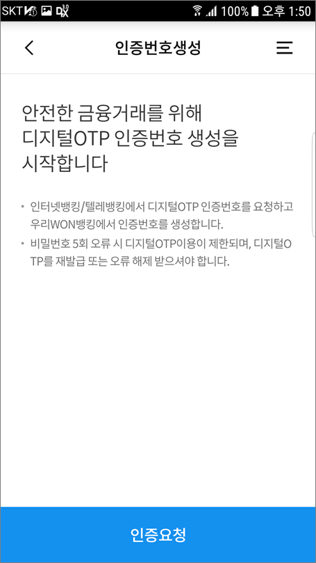 디저털OTP 발생기 정보입력에서 인증번호 요청을 선택합니다.