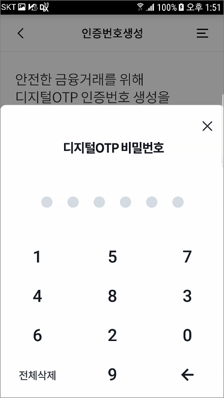 ⑤. 디지털OTP 인증번호생성 메뉴 화면입니다.