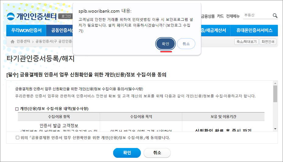 우리은행 공동인증서 타기관 인증서 등록하는 방법입니다.
