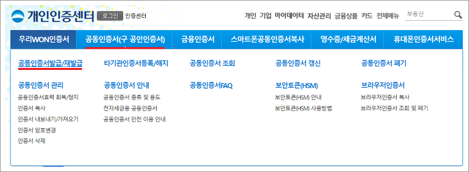 ②. 공동인증서(구 공인인증서)에서 공동인증서 발급/재발급 선택합니다.
