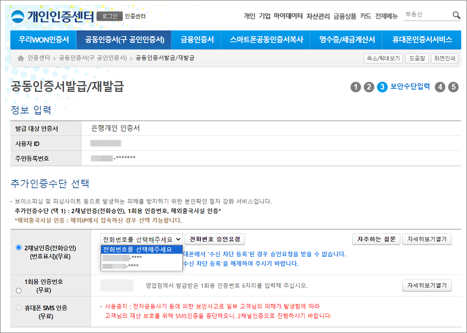 4. 보안수단 인증은 보안카드/OTP 또는 디지털 OTP 인증을 받아야 합니다.
