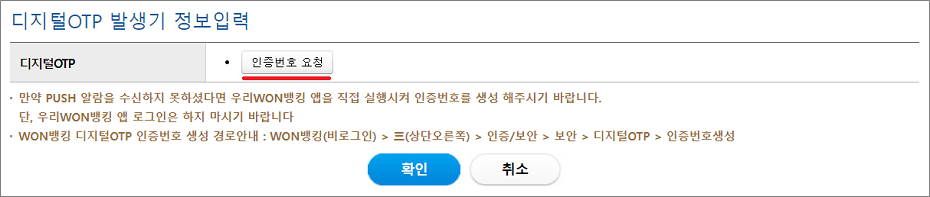 디지털 OTP는 인증번호 요청을 선택하고 모바일의 디지털 OTP에서 인증번호를 생성해서 6자리 숫자 입력합니다.