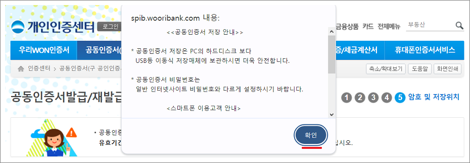 ⑨. 공동인증서 저장 안내 메시지가 나오면 확인 선택합니다.