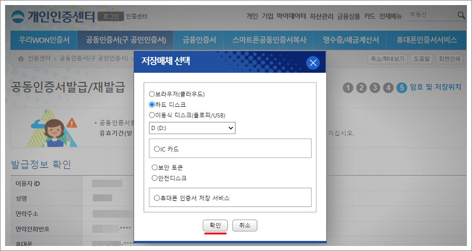 6. 인증서 저장은 하드 디스크, 이동식 디스크(USB) 등에서 선택합니다.