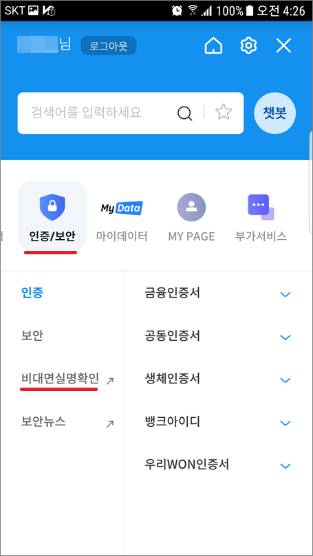 ③. 인증/보안에서 비대면 실명확인 선택합니다.