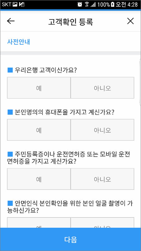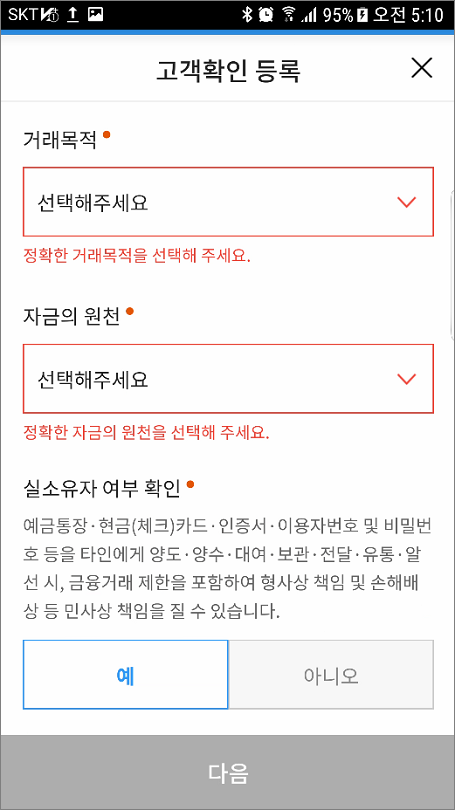 ⑦. 고객확인 등록에서 예를 선택합니다.