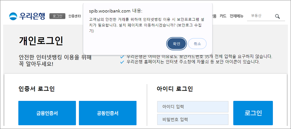 ②. 로그인을 위해서는 확인을 선택하고 보안프로그램 설치합니다.