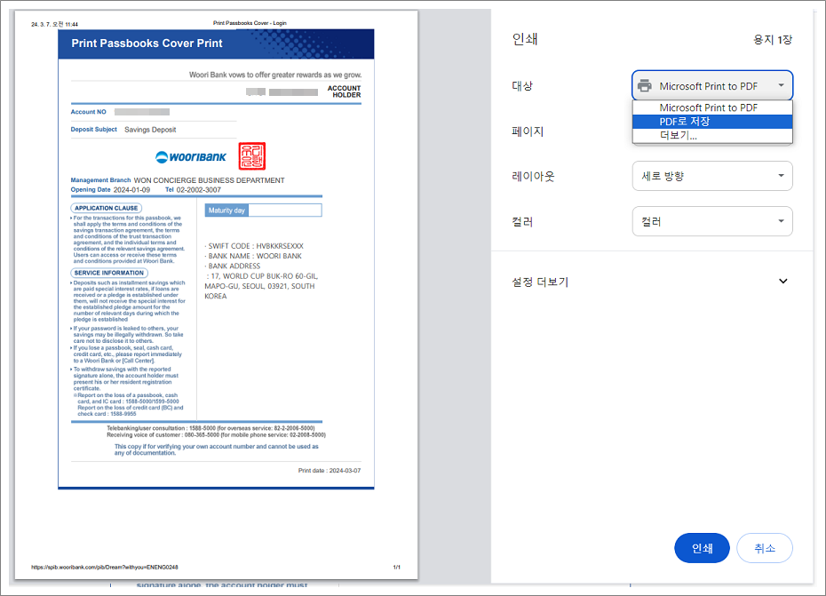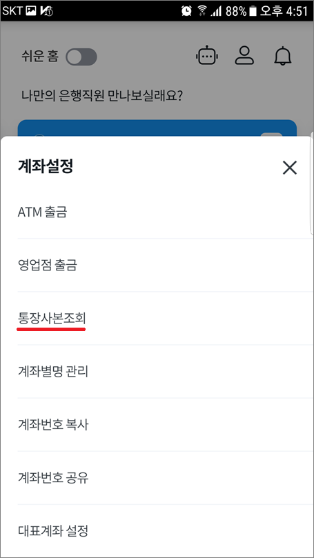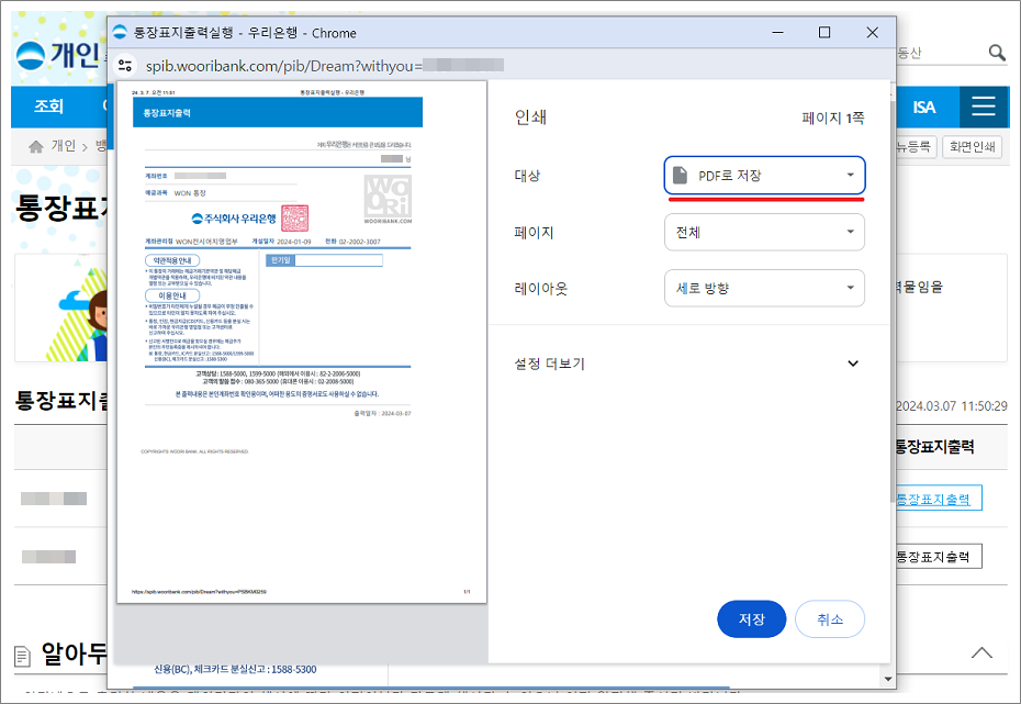 모바일에서는 통장사본, PC에서는 통장표지출력이라는 명칭을 사용합니다.