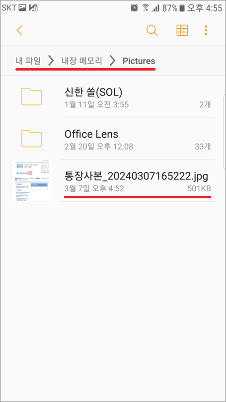 ⑥. 내 파일 > 내장 메모리 > Pictures 폴더에 통장사본이 저장됩니다.