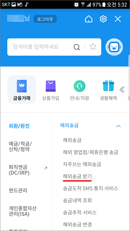 ④. 해외송금 받기 선택합니다.