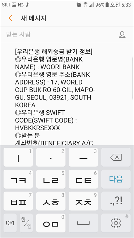 모바일에서 우리은행 SWIFE 코드를 문자, 카카오톡, 이메일 등을 사용해서 전달 가능합니다.