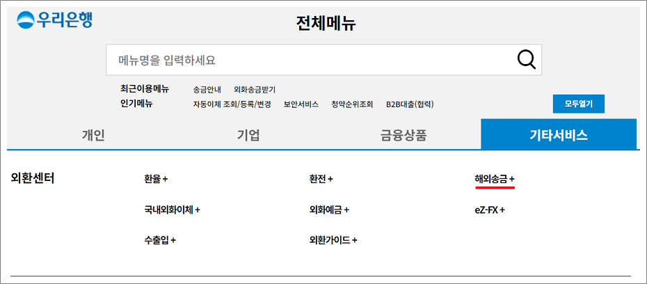 ③. 외환센터엣 해외송금+ 선택합니다.