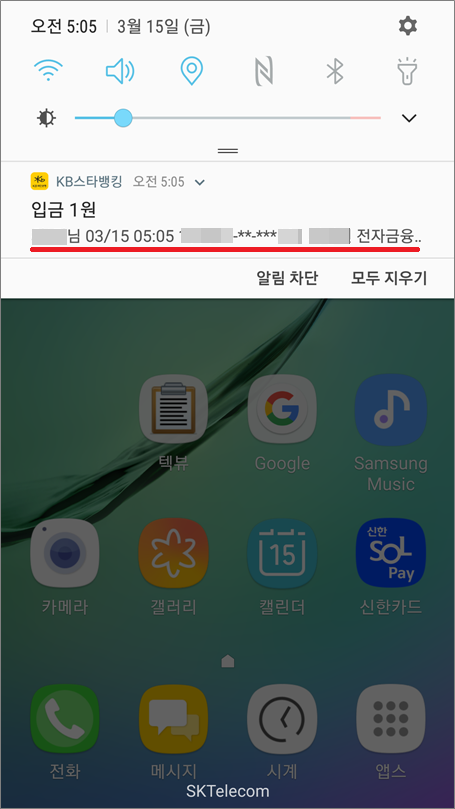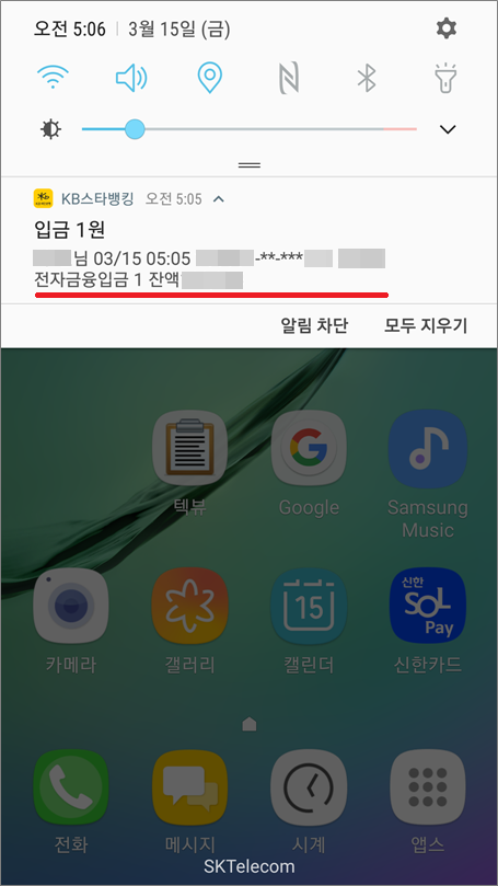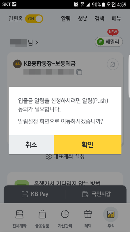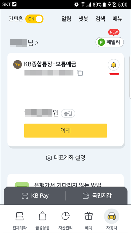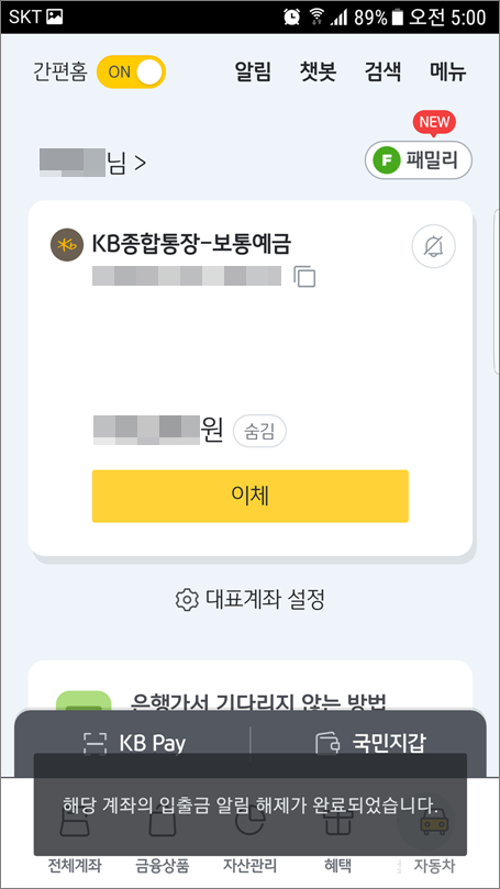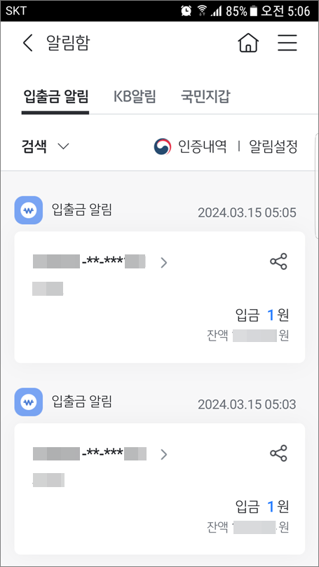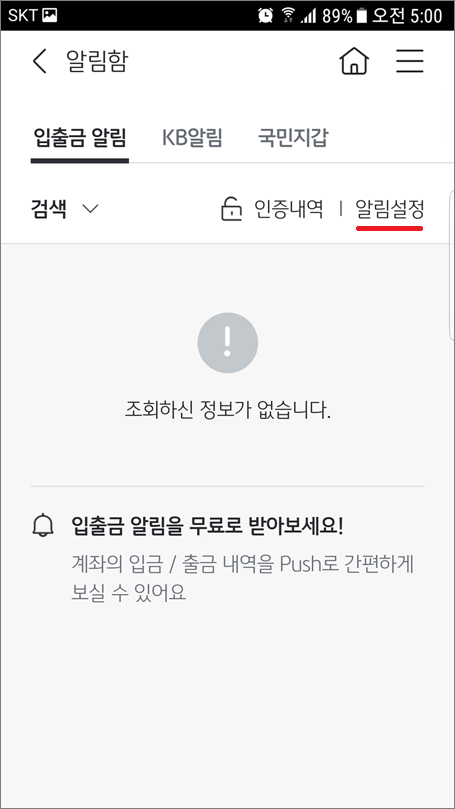 ⑤. 국민은행 입출금 알림이 설정되었습니다.