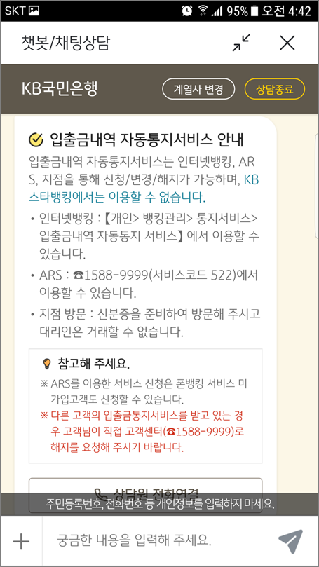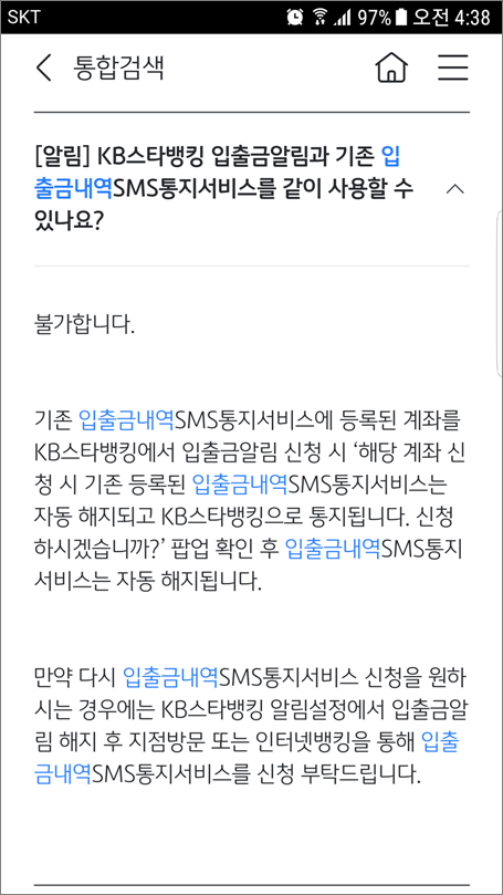 KB스타뱅킹 입출금 알림서비스 신청하면 입출금내역 자동서비스는 해지됩니다.