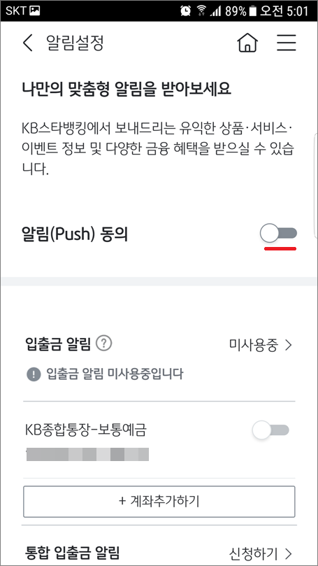④. 입출금 알림도 오른쪽으로 설정합니다.