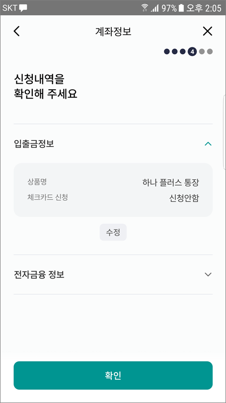 ⑪. 입출금 정보에는 하나 플러스 통장이고 체크카드 신청은 신청안함으로 나옵니다.