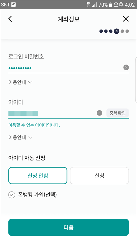 하나은행 아이디를 직접 만들 경우는 신청 안함 선택하면 됩니다.
