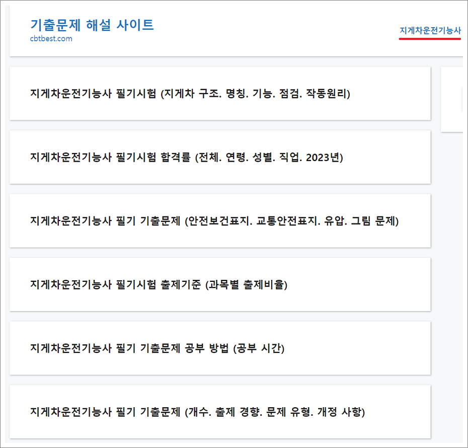 우측 상단의 지게차운전기능사 선택하면 필기시험 공부에 필요한 내용이 나옵니다.