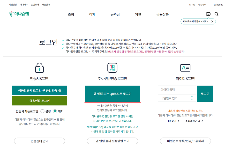 ❉. 하나은행 하나원큐인증 인터넷 뱅킹 로그인 방법. (앱 알림)
