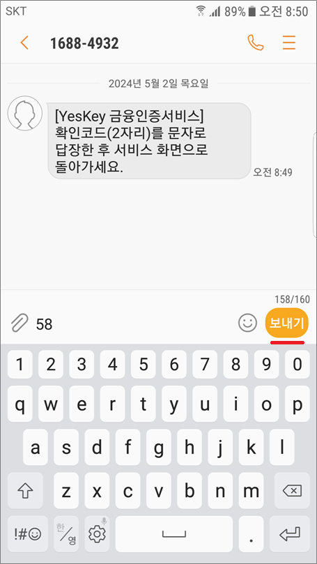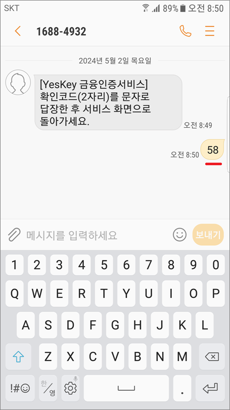 ④. 문자에 확인코드 2자리 입력하고 답장합니다.