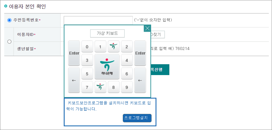 주민등록번호 또는 하나은행 ID, 생년월일 입력 중에서 선택합니다.