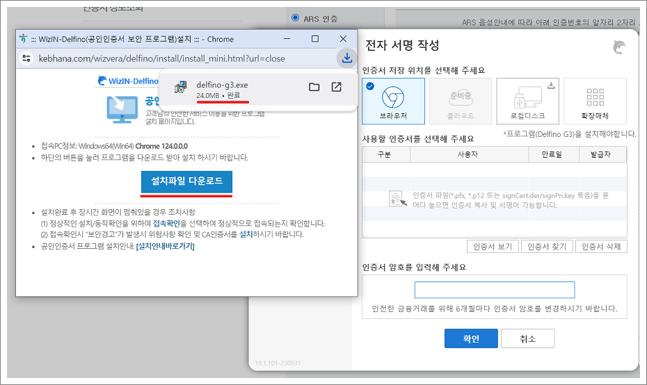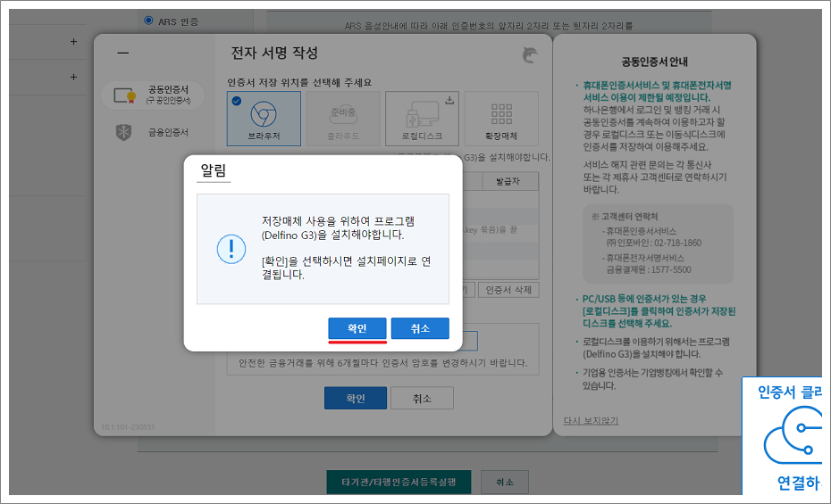 ②. 공인인증서 보안 (WizIN-Delfino G3) 프로그램을 설치하지 않은 경우 해당 프로그램을 설치해야 합니다.