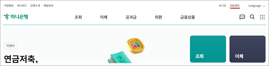 ①. 우측 상단의 인증센터 선택합니다.