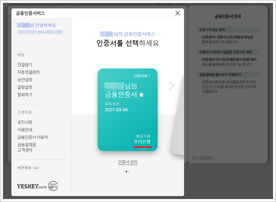 ⑥. PC화면은 자동으로 새로고침 되면서 본인의 금융인증서가 표시됩니다.