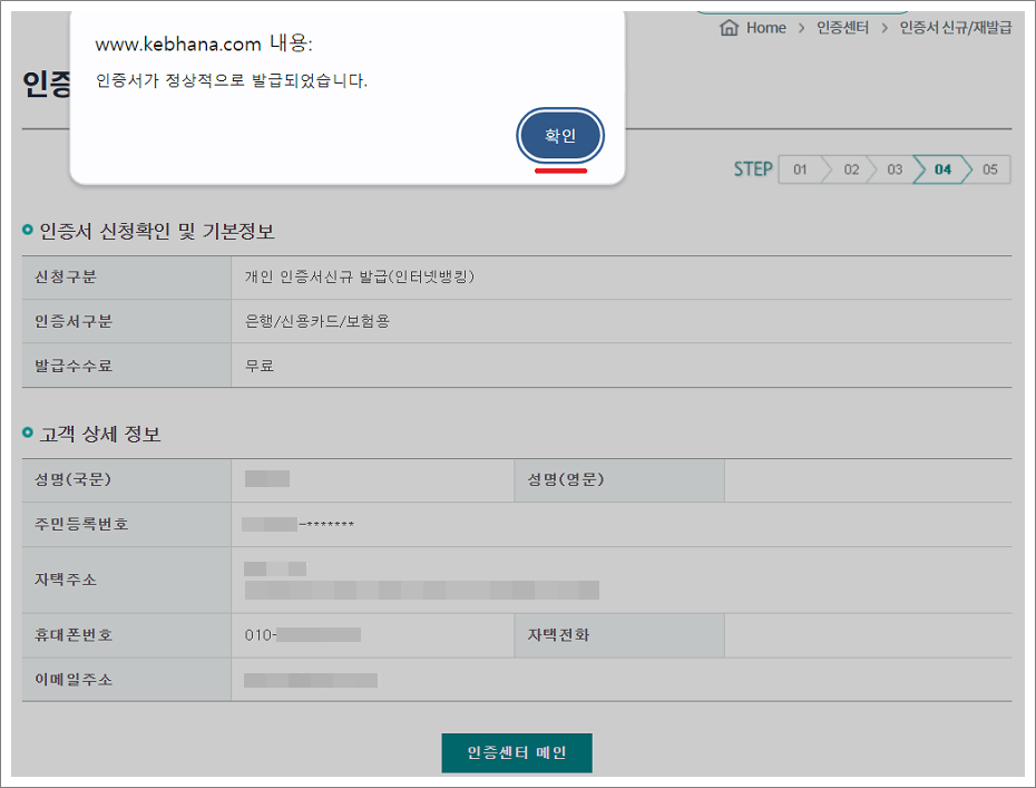 ⑬. 인증서가 정상적으로 발급되었습니다. 메시지가 나오면 확인 선택합니다.