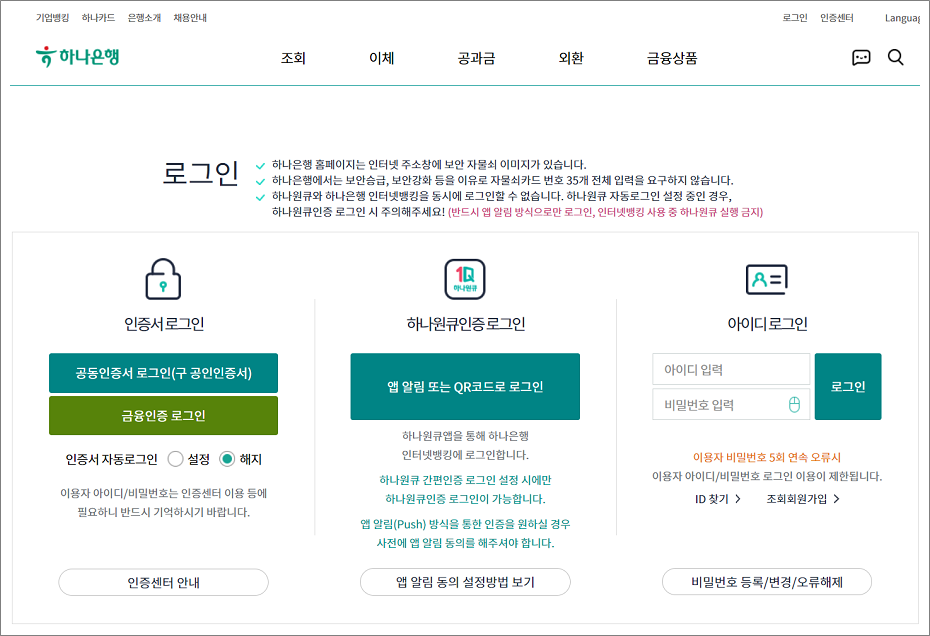 3. 로그인 방법은 금융인증서, 공동인증서, 하나원큐인증, 아이디 로그인 4가지 방법이 있습니다.