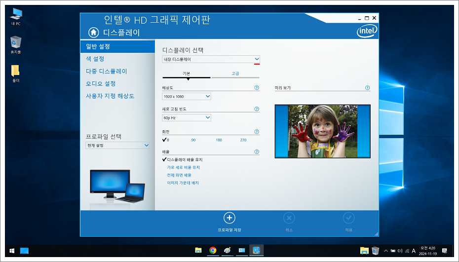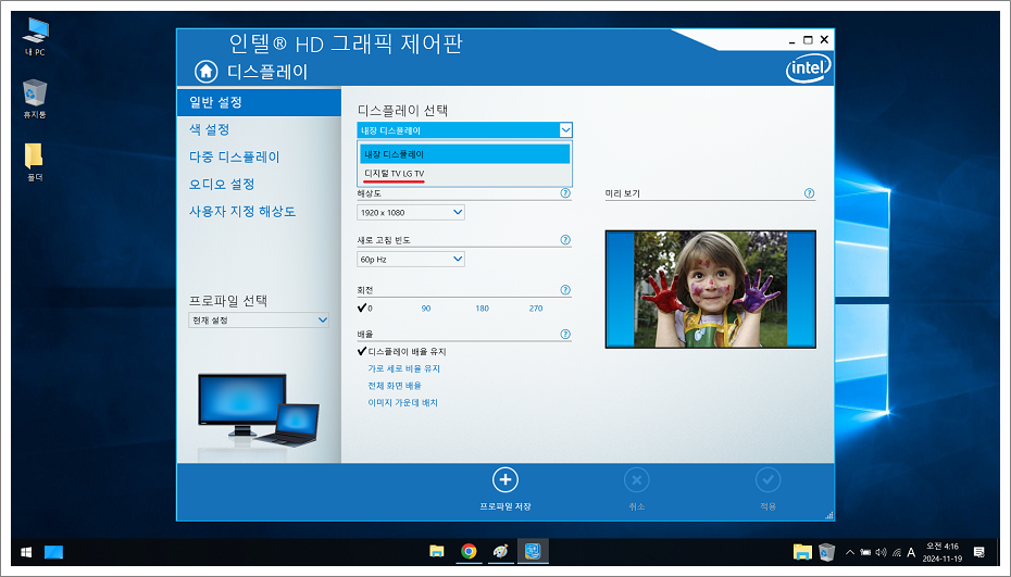 ①. 제어판 > 인텔 HD 그래픽 > 디스플레이 선택합니다.