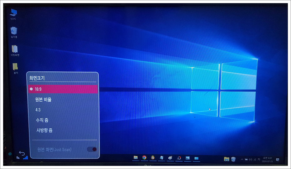 ②. 원본화면(Just Scan)이 꺼짐으로 되어있고 컴퓨터의 모니터 화면은 TV 화면에서 벗어난 상태입니다.