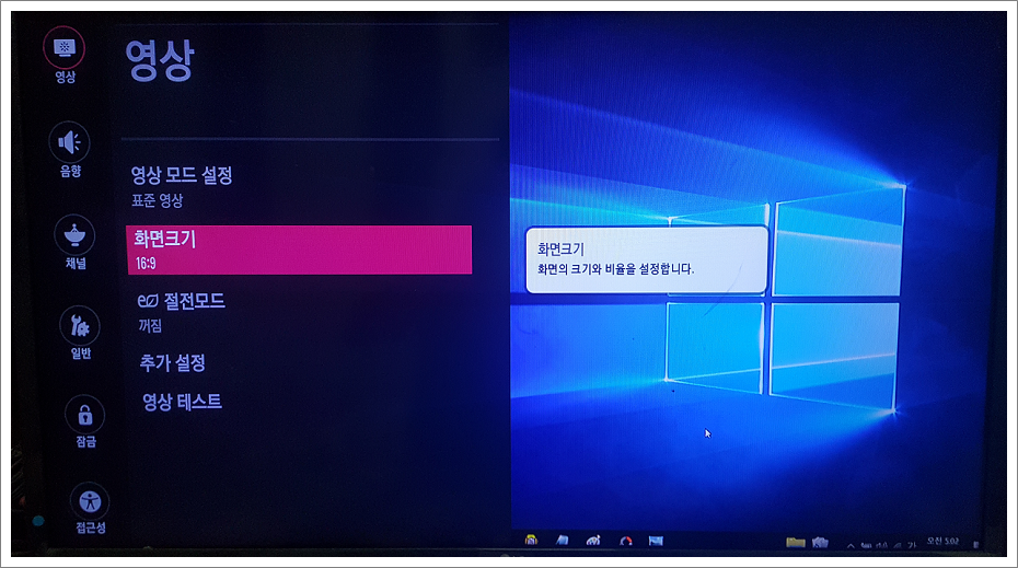 ①. LG TV 메뉴에서 영상 > 화면크기 선택합니다.