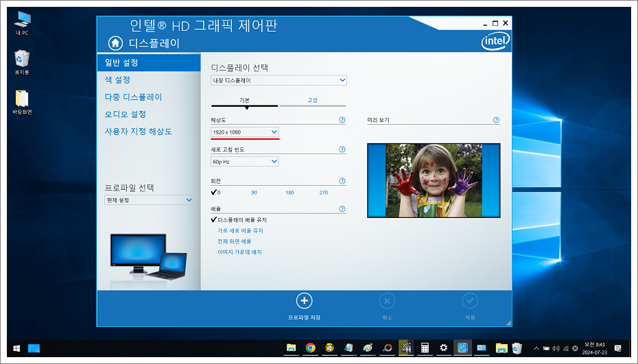해상도가 변경되면 기본값인 1920x1080으로 다시 설정합니다.