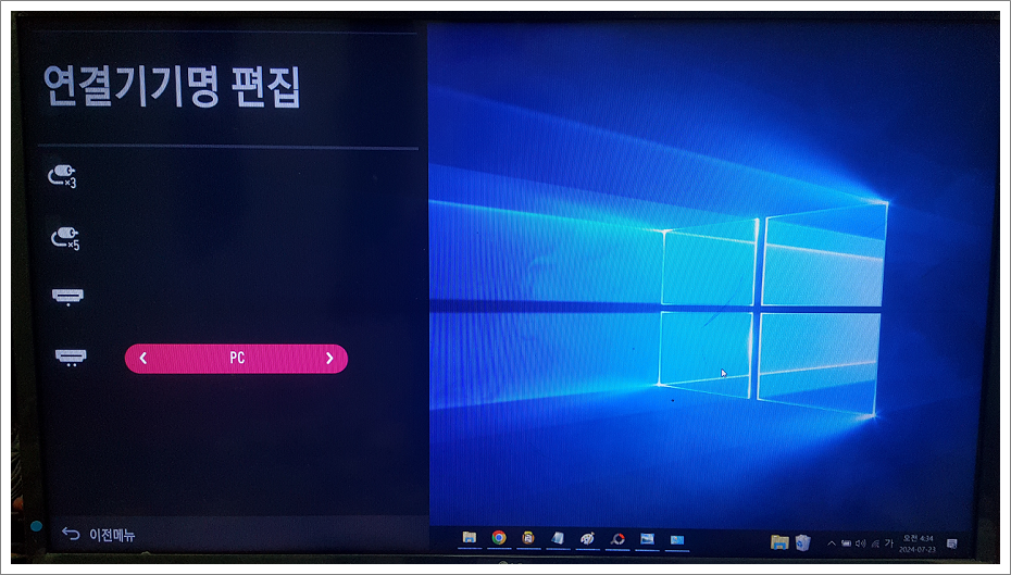 TV화면은 실시간으로 변경된 모습을 보여주기 때문에 PC 선택 후 정상적으로 나오면 확인 선택합니다.