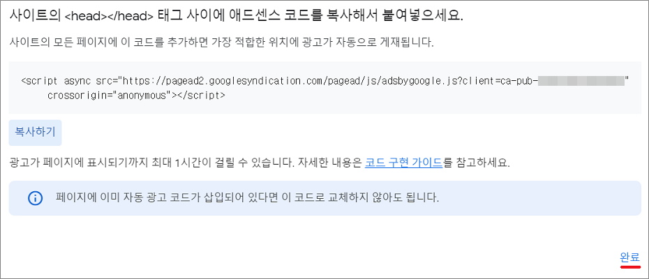 4. 구글 애드센스 홈페이지에 돌아와서 완료를 크릭 하면 됩니다.