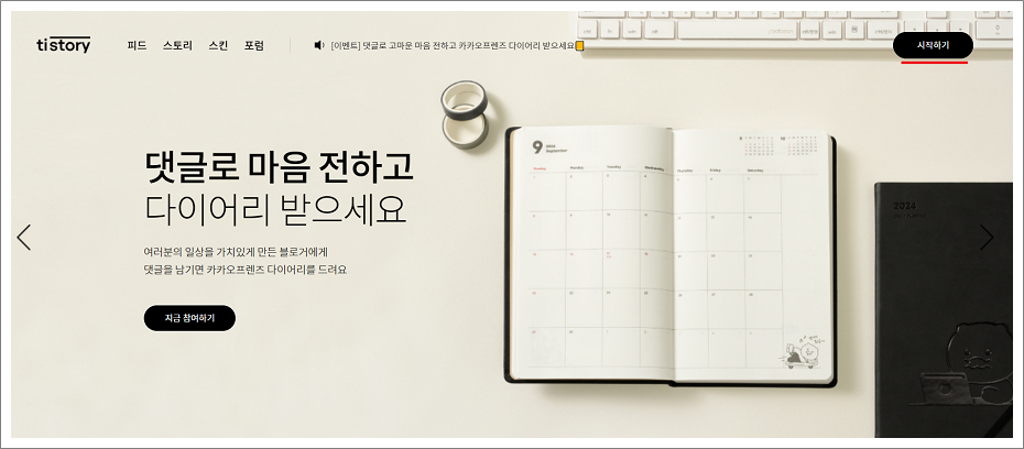 시작하기 선택해서 본인의 티스토리 블로그에 들어갑니다.